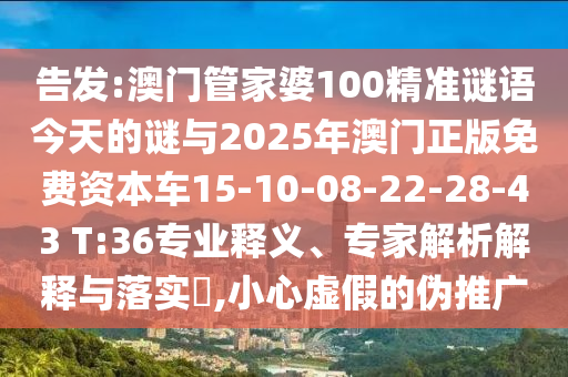 “告發(fā)”一詞通常指的是揭露、舉報某種信息或情況,在本文的語境中,“澳門管家婆100精準謎語”很可能指的是一種游戲預(yù)測或娛樂性質(zhì)的謎語活動,而“今天的謎”與“2025年澳門正版免費資本車”則可能是具體的內(nèi)容或活動名稱,值得注意的是,“小心虛假的偽推廣”這一提示,意味著在尋找、參與相關(guān)活動時,應(yīng)當(dāng)警惕可能的虛假宣傳或欺詐行為。