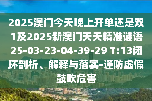 關(guān)于您提供的關(guān)鍵詞“2025澳門今天晚上開單還是雙1”、“2025新澳門天天精準(zhǔn)謎語25-03-23-04-39-29 T:13”以及“謹(jǐn)防虛假鼓吹危害-閉環(huán)剖析、解釋與落實(shí)”,我會逐一進(jìn)行釋義、解釋與落實(shí),并特別提醒公眾警惕虛假宣傳。